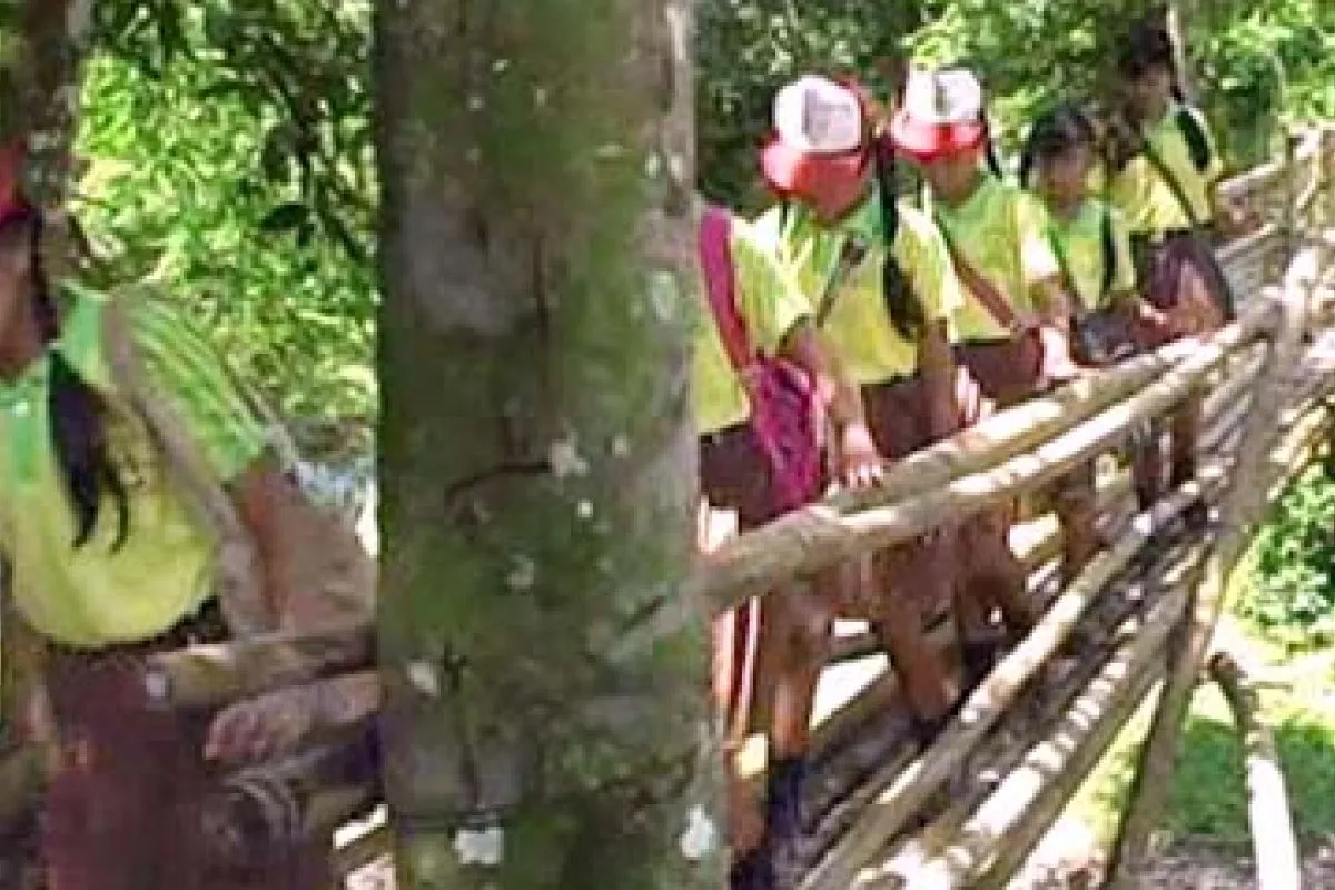Negara (Antara Bali) - Beberapa murid SD Negeri 1 Pendem melintasi jembatan bambu saat berangkat ke sekolah di Kelurahan Pendem, Jembrana, Minggu (26/2). Meski berbahaya ketika air sungai membesar saat hujan namun para siswa dan warga terpaksa melintasinya karena hingga kini belum tersentuh perbaikan secara permanen. FOTO ANTARA/Gembong Ismadi/12.