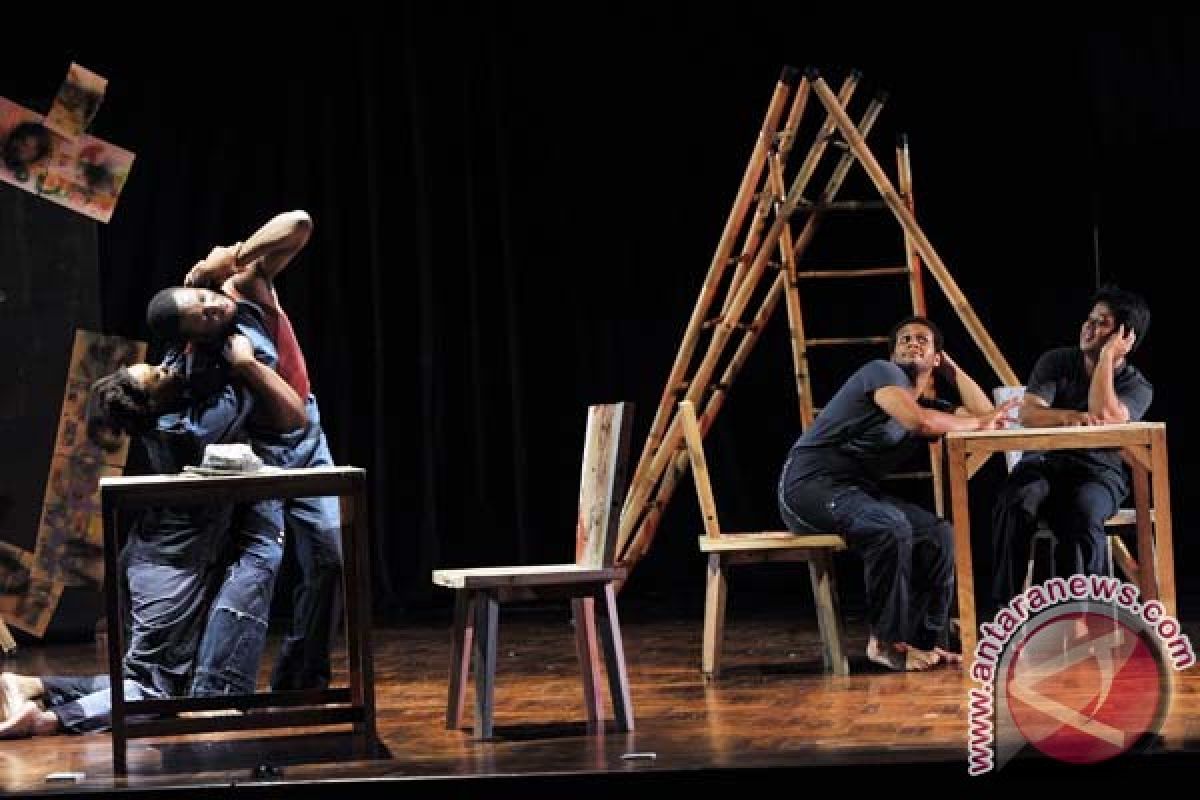 1Sejumlah seniman Bali dan Amerika Serikat (AS) menampilkan drama tari multimedia dalam pagelaran kesenian di Pesta Kesenian Bali ke-35, Denpasar, Bali, Jumat (29/6). Drama tari tersebut merupakan kolaborasi antara seniman Bali dengan mahasiswa College of The Holy Cross AS yang menampilkan kisah penderita gangguan kejiwaan berjudul Jiwa Terbelenggu. ANTARA FOTO/Nyoman Budhiana/nym/2013.