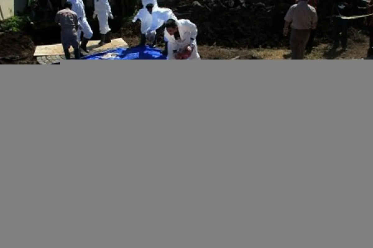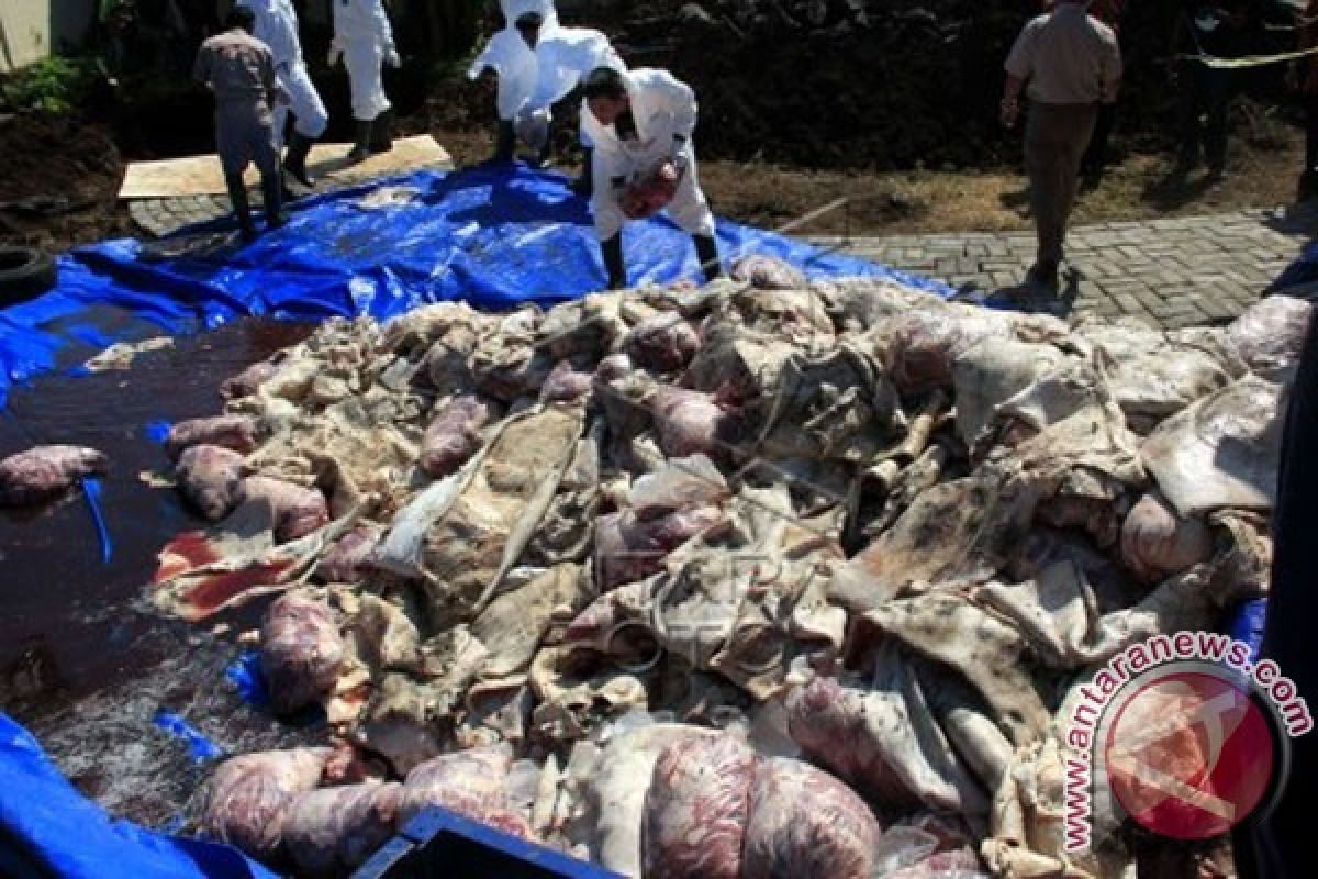 1Petugas Balai Karantina Pertanian (BKP) Kelas II Cilegon mengangkat daging celeng ilegal untuk dimusnahkan, di Cikuasa, Merak, Banten, Jumat (20/6). Sebanyak 6.920 kg daging celeng tanpa dilengkapi surat yang diangkut truk bernomor H 1886 AB dari Palembang tujuan Bekasi disita petugas saat melintas di Merak. ANTARA FOTO/Asep Fathulrahman/wdy/14.