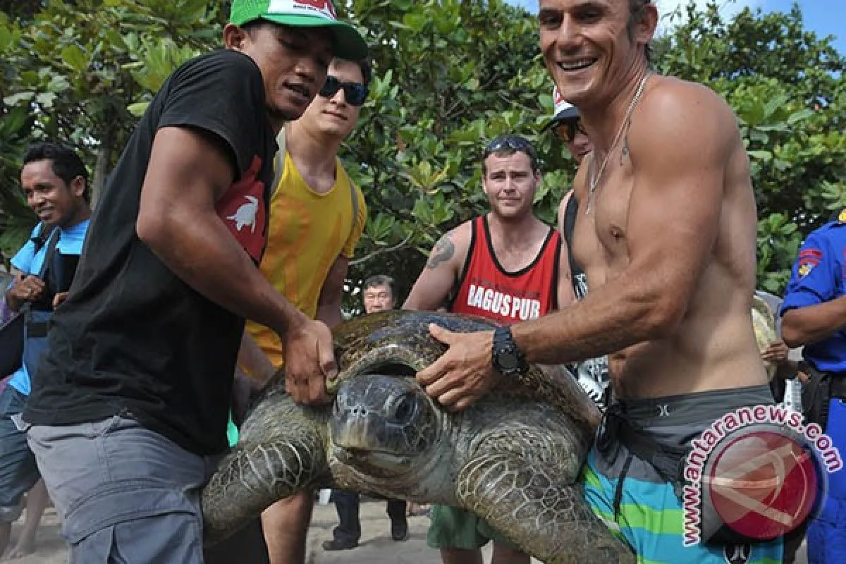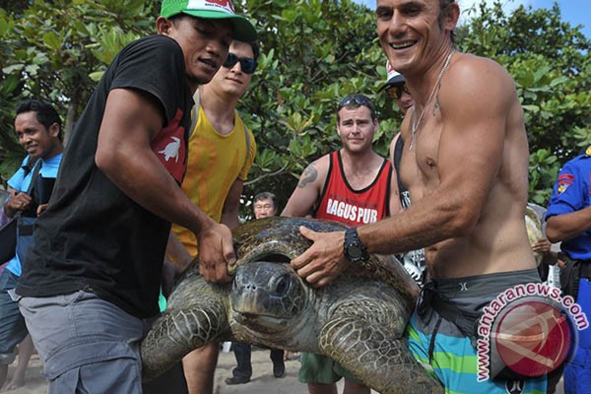 1Sejumlah wisatawan menggotong Penyu Hijau (Chelonia Mydas) yaitu hasil sitaan polisi dan BKSDA Bali dari penyelundupan, saat pelepasan kembali satwa langka itu di Pantai Kuta, Bali, Kamis (30/7).Sebanyak 8 ekor penyu yang diselundupkan dari Madura ke Bali sekitar bulan Juni 2015 dilepaskan kembali ke habitatnya dengan melibatkan wisatawan di Pantai Kuta. ANTARA FOTO/Nyoman Budhiana/i018/2015.