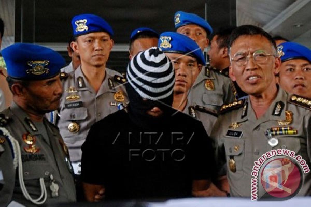 1Kabid Humas Polda Jateng Kombes A Liliek Darmanto (kanan) menunjukkan oknum anggota Brimob Polda Jateng, Brigadir Supriyanto (tengah) yang menjadi pelaku perampokan, kepada wartawan di Markas Polda Jawa Tengah, Semarang, Kamis (1/10). Selain Brigadir Supriyanto, Polisi juga menangkap dua oknum anggotaTNI yang terlibat, yakni Sertu T dan Sertu T setelah pada Senin (28/9) ketiganya merampok uang yang dibawa karyawan PT Advantage (jasa pengangkutan uang) di Tengaran, Kabupaten Semarang. ANTARA FOTO/Aditya Pradana Putra/wdy/15.