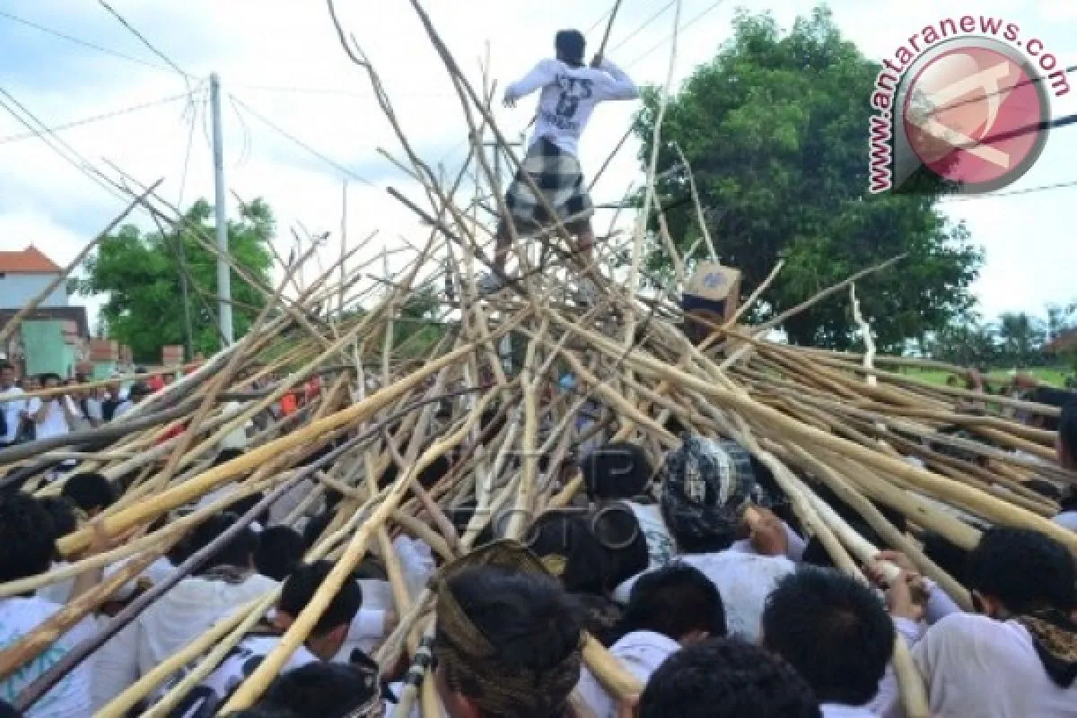 1Seorang pemuda berdiri diatas tongkat yang disatukan warga saat Tradisi Mekotek di Desa Munggu, Kabupaten Badung, Bali, Sabtu (20/2). Tradisi Mekotek yang secara turun temurun dilakukan warga setempat bertepatan dengan Hari Raya Kuningan dilakukan sebagai simbol kemenangan dan upaya menolak bala. ANTARA FOTO/Fikri Yusuf/wdy/16.