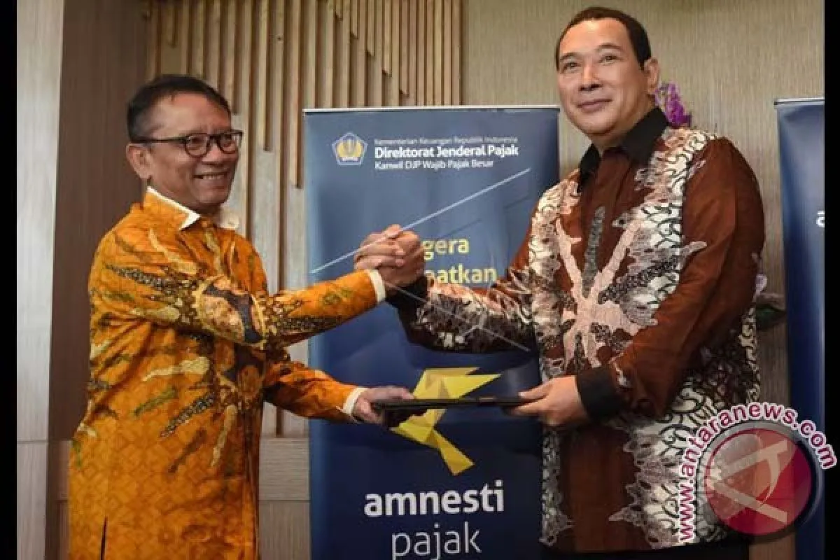 1Dirjen Pajak Ken Dwijugiasteadi (kiri) menyerahkan tanda terima surat pelaporan harta kepada pengusaha nasional Hutomo Mandala Putra atau Tommy Soeharto (kanan) di Kantor Wilayah (Kanwil) Pajak Besar IV Sudirman, Jakarta, Kamis (15/9). Tommy yang saat ini memiliki bisnis properti dengan nama PT Kencana Graha Optima, serta memiliki PT Humpuss Intermoda Transportasi Tbk yang didirikan sejak 1984, mendaftarkan diri sebagai peserta program pengampunan pajak (tax amnesty). ANTARA FOTO/Yudhi Mahatma/wdy/16