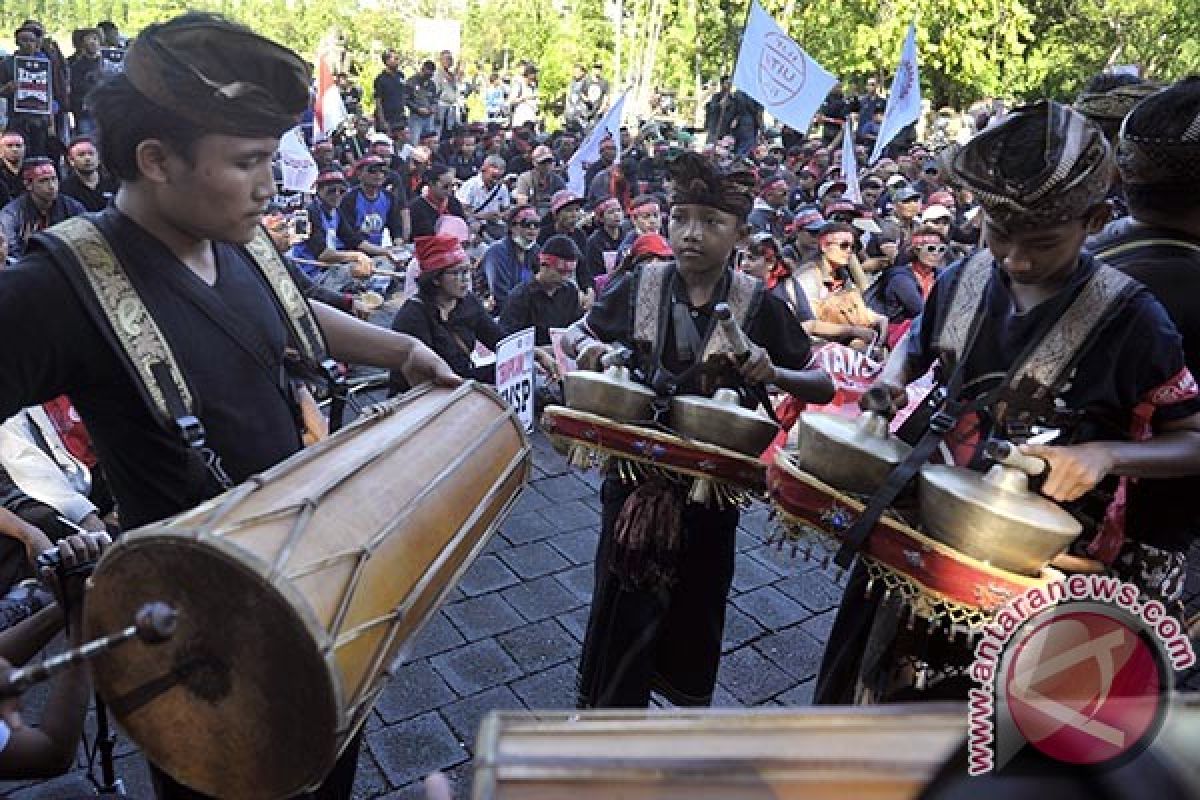 1Para pengunjuk rasa menggelar atraksi kesenian Balaganjur dalam aksi Hari Buruh di depan Kantor Gubernur Bali, Senin (1/5). Ratusan pengunjuk rasa yang tergabung dalam Aliansi Buruh Bali Bersatu menuntut pencabutan sistem kerja kontrak, 'out sourcing', penghentian pengekangan berserikat dan pencabutan Peraturan Pemerintah Nomor 78 tahun 2015 karena dinilai tidak relevan lagi terkait pengupahan. Antara Bali/Nyoman Budhiana/17.