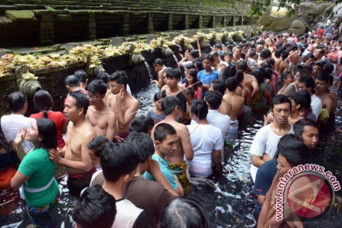 1Sejumlah Umat Hindu membersihkan diri atau melukat dalam rangkaian peringatan Hari Raya Saraswati di Pura Tirta Empul, Kabupaten Gianyar, Bali, Minggu (20/8). Hari raya yang jatuh setiap 310 hari sekali tersebut diperingati oleh Umat Hindu dengan melakukan persembahyangan bersama dan dilanjutkan pada pagi harinya membersihkan diri di sejumlah mata air di Pulau Dewata. ANTARA FOTO/Wira Suryantala/wdy/2017.