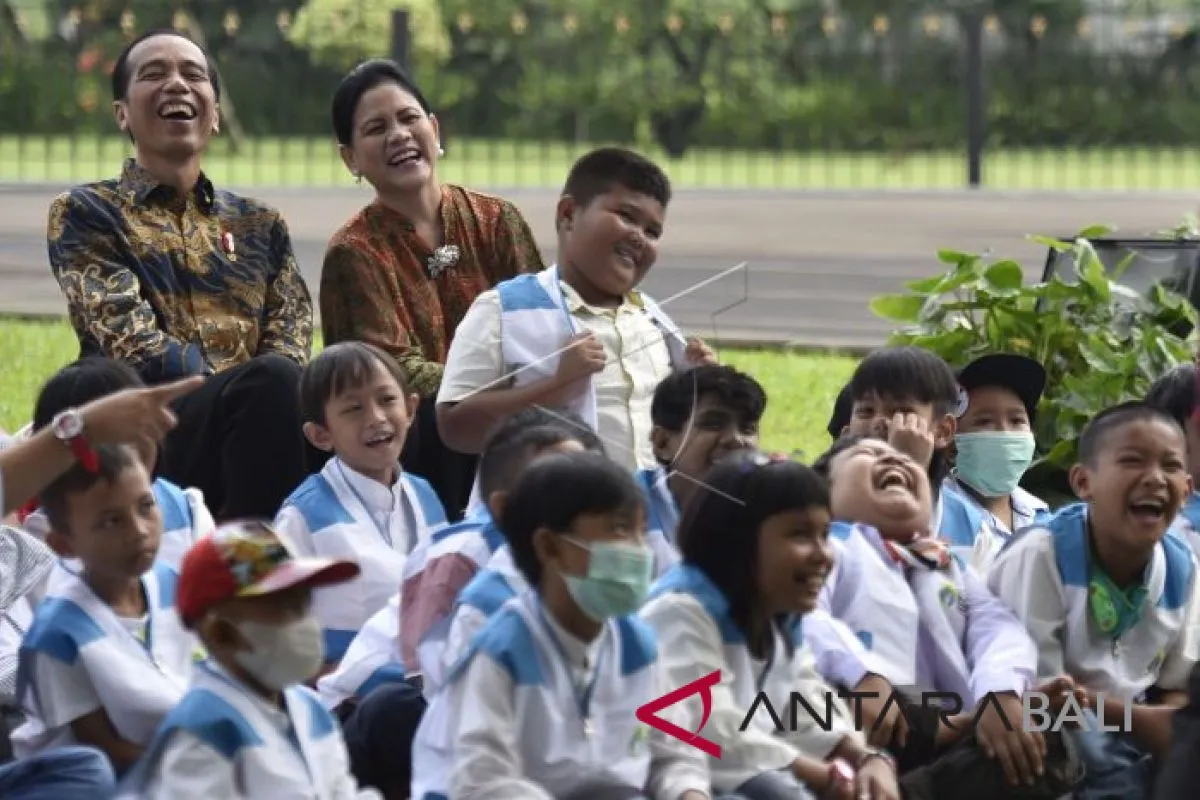 Presiden Joko Widodo (kiri) didampingi Ibu Negara Iriana Joko Widodo dan anak-anak penderita kanker pendampingan Yayasan Kanker Anak Indonesia tertawa saat menyaksikan pertunjukan sulap disela-sela silaturahmi di halaman belakang Istana Bogor, Jawa Barat, Jumat (6/4). Yayasan Kanker Anak Indonesia dalam kesempatan tersebut meminta regulasi impor obat kanker dipermudah dan bea masuk ditiadakan. ANTARA FOTO/Puspa Perwitasari/wdy/2018