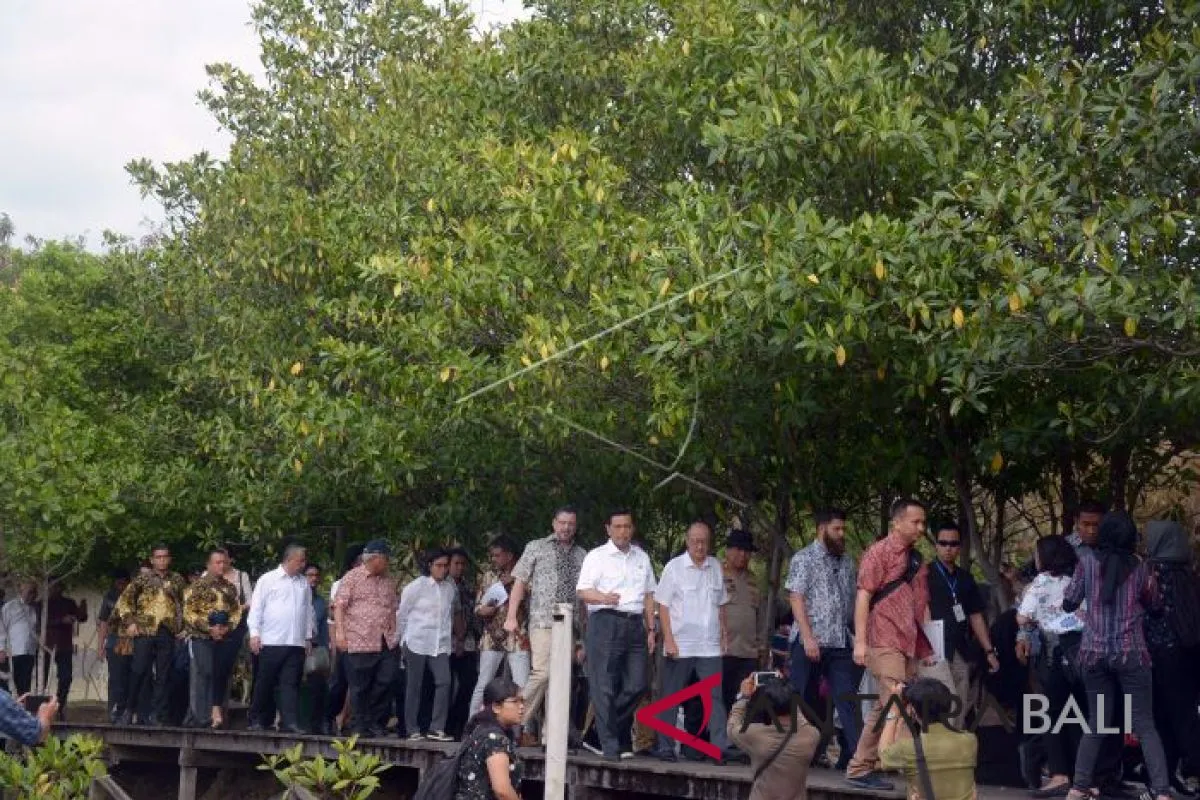 Menko Maritim Luhut Binsar Panjaitan (tengah) berjalan berdampingan dengan Presiden Bank Dunia (World Bank) Jim Yong Kim saat melakukan kunjungan kerja di kawasan wisata Mangrove di Denpasar, Jumat (6/7). Pemerintah Indonesia menjalin kerja sama dengan World Bank dalam penanganan masalah sampah di Indonesia. ANTARA FOTO/Wira Suryantala/wdy/2018.