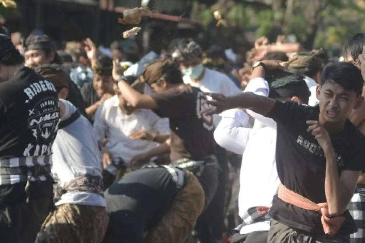 Sejumlah warga melempar ketupat ke arah warga lainnya saat tradisi Perang Ketupat di Desa Kapal, Badung, Bali, Senin (24/9). Tradisi setahun sekali yang merupakan rangkaian persembahyangan warga setempat tersebut dilakukan sebagai wujud syukur kepada Tuhan Yang Maha Esa atas kesejahteraan dan kesuburan lahan pertanian yang telah memberi hasil berlimpah. ANTARA FOTO/Fikri Yusuf/wdy/2018.