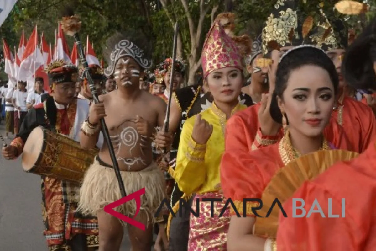 Sejumlah remaja mengenakan busana adat Nusantara saat mengikuti kegiatan Gema Perdamaian 2018 di Lapangan Niti Mandala Renon, Denpasar, Bali, Sabtu (6/10). Kegiatan tahunan tersebut diikuti ribuan peserta lintas-agama dengan melakukan doa bersama serta mengajak seluruh umat manusia hidup dalam perdamaian dan menghentikan segala bentuk konflik dan kekerasan di seluruh dunia. ANTARA FOTO/Fikri Yusuf/wdy/2018