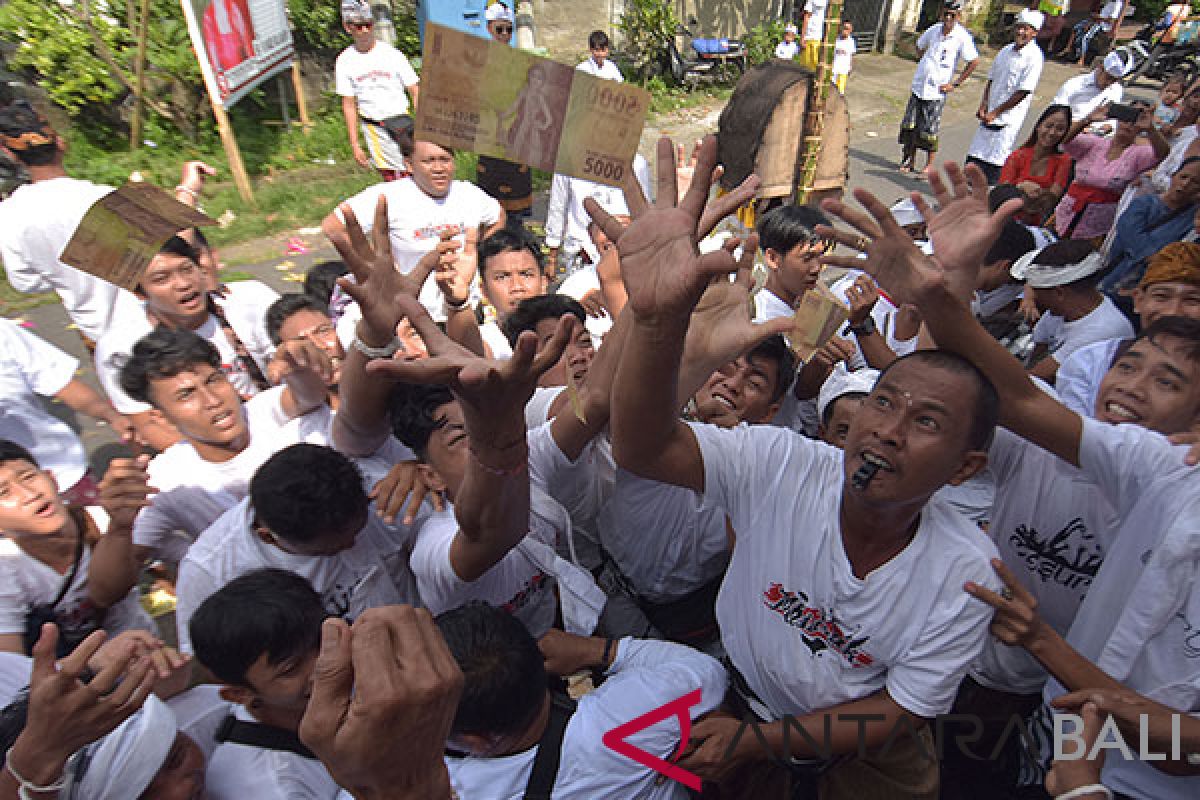 Warga saling berebut menangkap uang yang dilemparkan warga lainnya dalam tradisi Mesuryak di Desa Bongan Gede, Tabanan, Bali, Sabtu (5/1/2019). Tradisi yang bertepatan dengan perayaan Hari Raya Kuningan itu bertujuan beramal sekaligus mengantarkan roh para leluhurnya kembali ke asalnya dengan rasa suka cita. ANTARA FOTO/Nyoman Hendra Wibowo/nym.