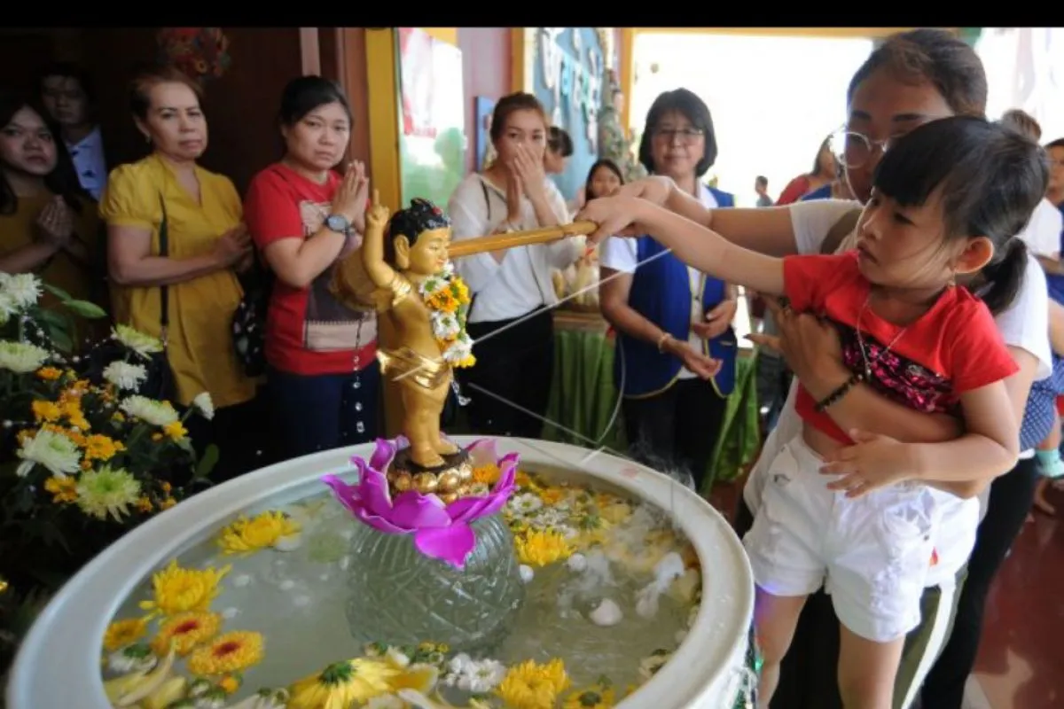 Umat Buddha mengikuti prosesi pemandian Rupang Buddha saat kebaktian Hari Waisak di Vihara Buddha Dharma, Kuta, Bali, Minggu (19/5/2019). Perayaan Waisak 2563 B.E/2019 tersebut dilakukan dengan kegiatan Kebaktian Hari Waisak, meditasi bersama dan Pindapatta. ANTARA FOTO/Fikri Yusuf/nym.