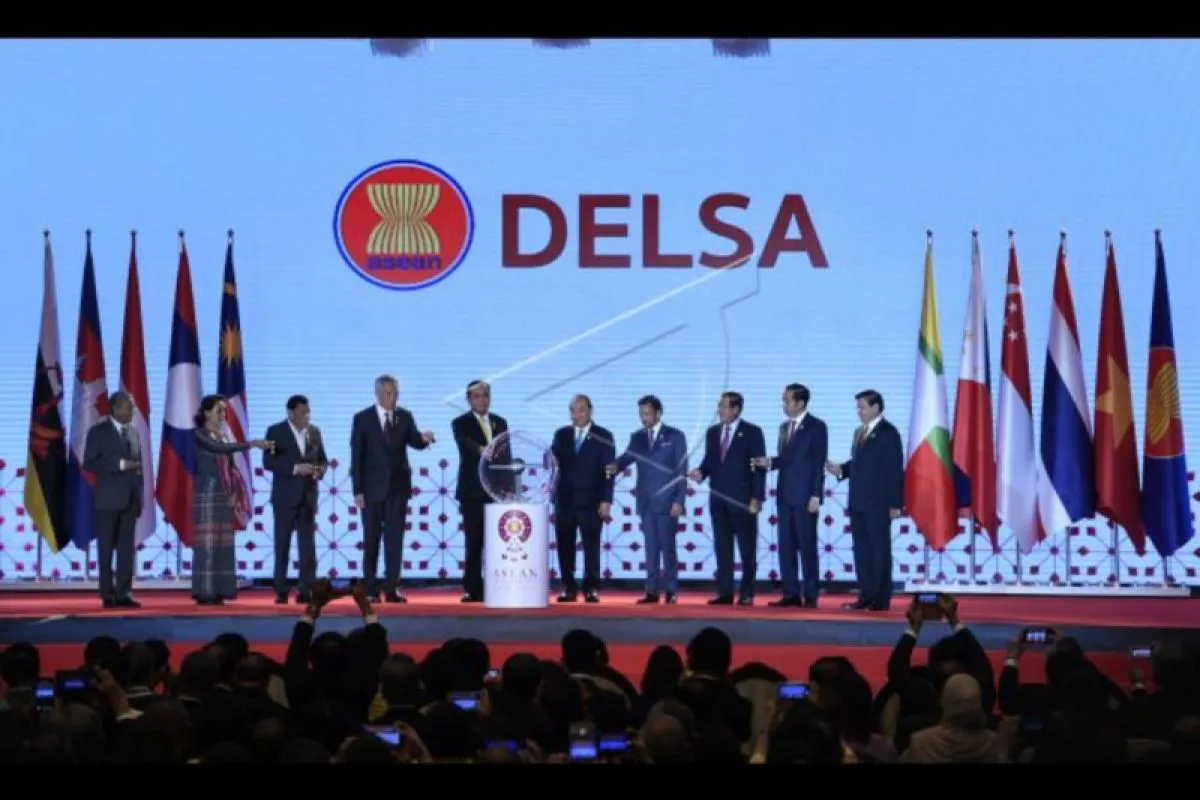 Dari kiri), PM Malaysia Mahathir Muhamad, Penasehat Negara Myanmar Aung San Suu Kyi, Presiden Filipina Rodrigo Duterte, PM Singapura Lee Hsien Loong, PM Thailand Prayut Chan, PM Vietnam Nguyen Xuan Phuc, Sultan Brunei Hassanal Bolkiah, Perdana Menteri Kamboja Hun Sen, Presiden Joko Widodo dan Presiden Laos Bounnhang Vorachith meluncurkan DELSA Satelit disela-sela pembukaan KTT ASEAN ke-34 di Bangkok, Thailand, Minggu (23/6/2019). ANTARA FOTO/Puspa Perwitasari/nym.