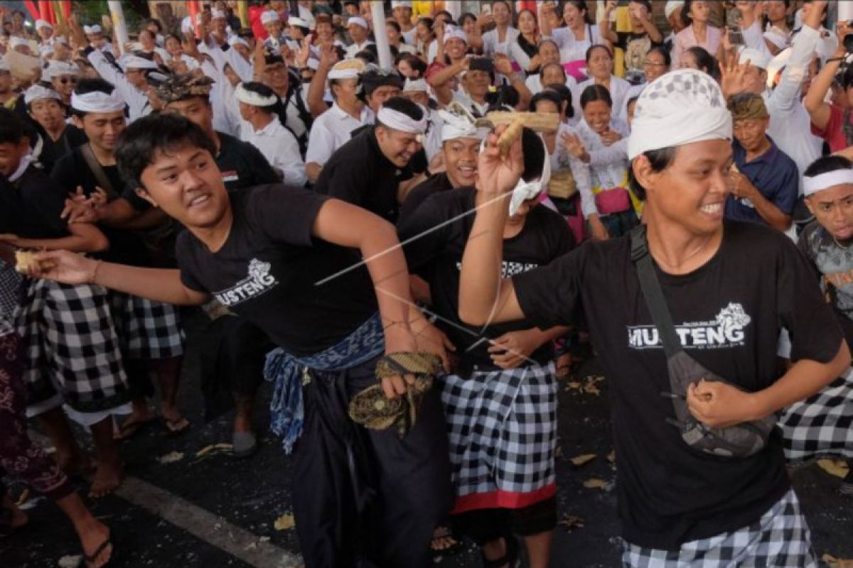 Umat Hindu saling melempar ketupat dalam tradisi perang ketupat di Desa Kerobokan, Badung, Bali, Kamis (1/8/2019). Tradisi Perang Ketupat tersebut diikuti sekitar 500 warga sebagai wujud syukur dan penolak bala. ANTARA FOTO/Nyoman Hendra Wibowo/nym.