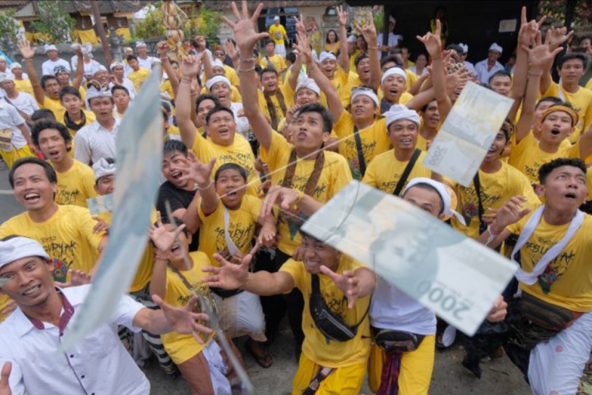 Umat Hindu saling berebut menangkap uang yang dilemparkan warga dalam tradisi Mesuryak di Desa Bongan Gede, Tabanan, Bali, Sabtu (3/8/2019). Tradisi Mesuryak digelar setiap Hari Raya Kuningan untuk beramal sekaligus memberikan bekal dan mengantarkan roh para leluhur kembali ke Sang Pencipta dengan rasa suka cita. ANTARA FOTO/Nyoman Hendra Wibowo/nym.