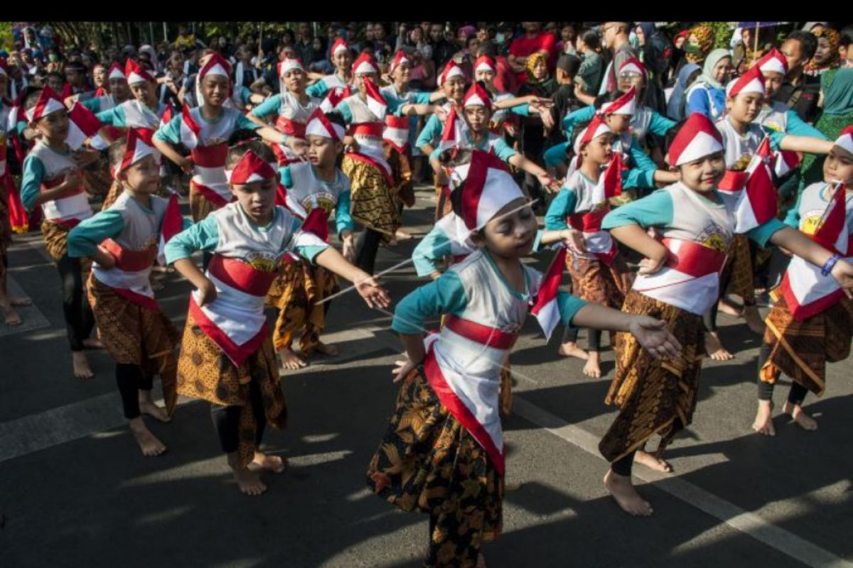 Sejumlah penari membawakan Tari Kolosal Kembang Tanjung pada acara Kariaan Agustusan di Kawasan Hari Bebas Kendaraan, Cimahi, Jawa Barat, Minggu (25/8/2019). Sedikitnya 250 penari tampil dalam kegiatan yang bertujuan untuk mengenalkan potensi pariwisata di Kota Cimahi. ANTARA FOTO/Novrian Arbi/nym.
