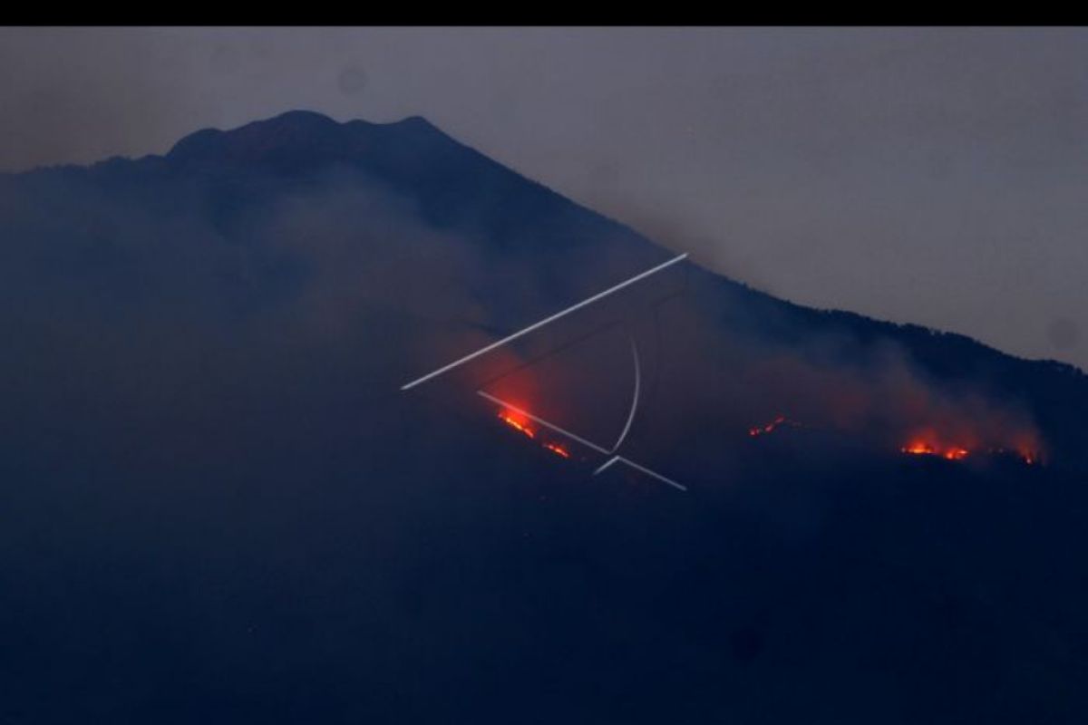 Api membakar hutan di lereng Gunung Arjuno terlihat dari Desa Landungsari, Malang, Jawa Timur, Jumat (11/10/2019). Kawasan hutan yang terbakar berada di petak Curah Seriti di ketinggian 2.300 mdpl dengan kemiringan 70 derajat sehingga menjadi kendala bagi petugas untuk memadamkan api. ANTARA FOTO/Ari Bowo Sucipto/nym.