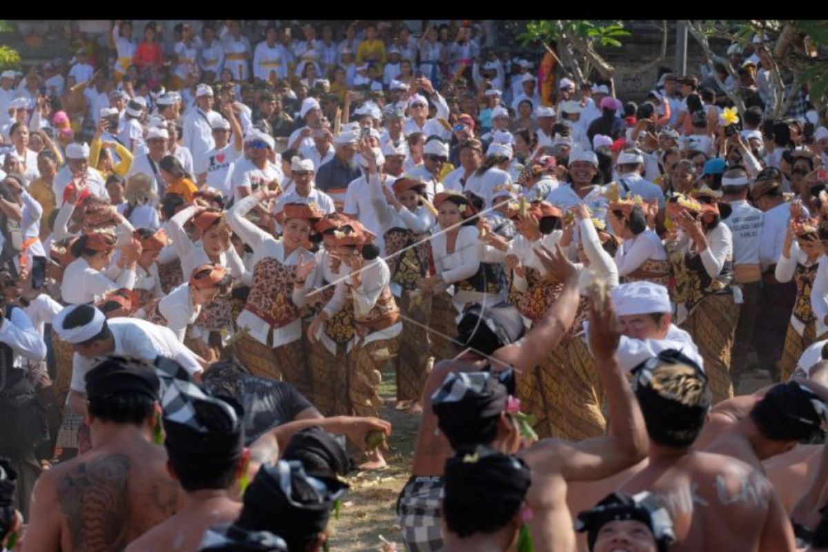 Sejumlah warga melempar ketupat ke arah warga lainnya dalam tradisi perang ketupat di Desa Kapal, Badung, Bali, Minggu (13/10/2019). Tradisi tahunan yang digelar sejak tahun 1339 tersebut merupakan rangkaian persembahyangan untuk memohon kesejahteraan serta wujud syukur atas kesuburan pada lahan pertanian. ANTARA FOTO/Nyoman Hendra Wibowo/nym.