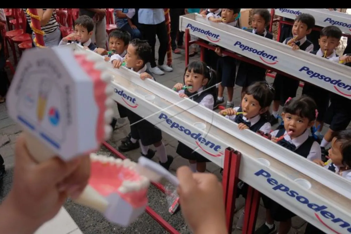 Sejumlah anak sekolah mendapat pelatihan cara menggosok gigi yang benar dalam gerakan Indonesia Terseyum berkenaan dengan Bulan Kesehatan Gigi Nasional (BKGN) ke-10 di Rumah Sakit Gigi dan Mulut (RSGM) Fakultas Kedokteran Gigi Universitas Mahasaraswati Denpasar, Bali, Senin (14/10/2019). Kegiatan pelayanan kesehatan gigi dan edukasi menggosok gigi tersebut diselenggarakan di 24 Fakultas Kedokteran Gigi dan 40 Cabang Persatuan Dokter Gigi Indonesia (PDGI) di berbagai wilayah Indonesia hingga Desember mendatang dengan target menjangkau 64.000 orang. ANTARA FOTO/Nyoman Hendra Wibowo/nym.