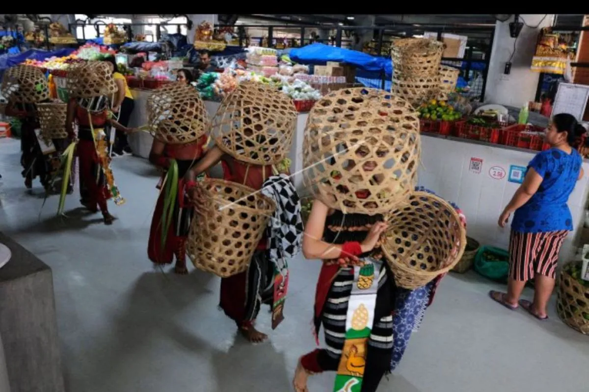 Seniman asal Jepang Jasmine Okubo (depan) berkolaborasi dengan tujuh penyandang tunarungu dan tunawicara saat menampilkan tari kontemporer berjudul "Wong Peken" dalam Festival Pasar Rakyat Denpasar 2019 di Pasar Badung, Denpasar, Bali, Minggu (10/11/2019). Tarian menceritakan tentang mahkluk halus penunggu pasar tersebut merupakan pertunjukan untuk memperkenalkan pasar tradisional kepada masyarakat sebagai tempat bersosialisasi. ANTARA FOTO/Nyoman Hendra Wibowo/nym
