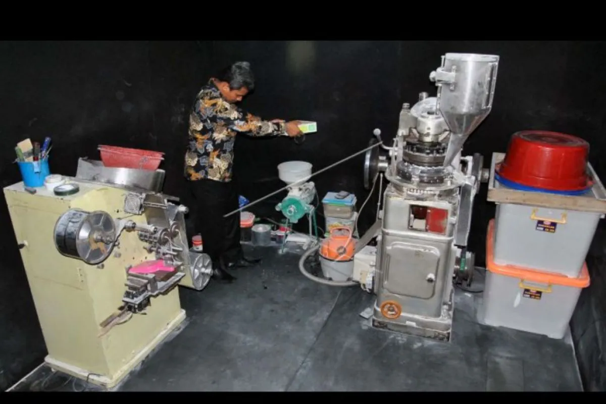 Kepala Loka POM Bogor Muhammad Rusydi Ridha memeriksa salah satu mesin pembuat obat palsu saat menggerebek rumah produksi obat palsu di Gang Pesantren RT 02/07, Kelurahan Kedung Waringin, Tanah Sareal, Kota Bogor, Jawa Barat, Rabu (20/11/2019). Satreskrim Polresta Bogor Kota menggerebek sebuah rumah yang dijadikan tempat produksi obat palsu dan mengamankan dua tersangka serta 11 mesin yang dijadikan alat untuk memproduksi obat palsu tersebut. ANTARA FOTO/Arif Firmansyah/nym.