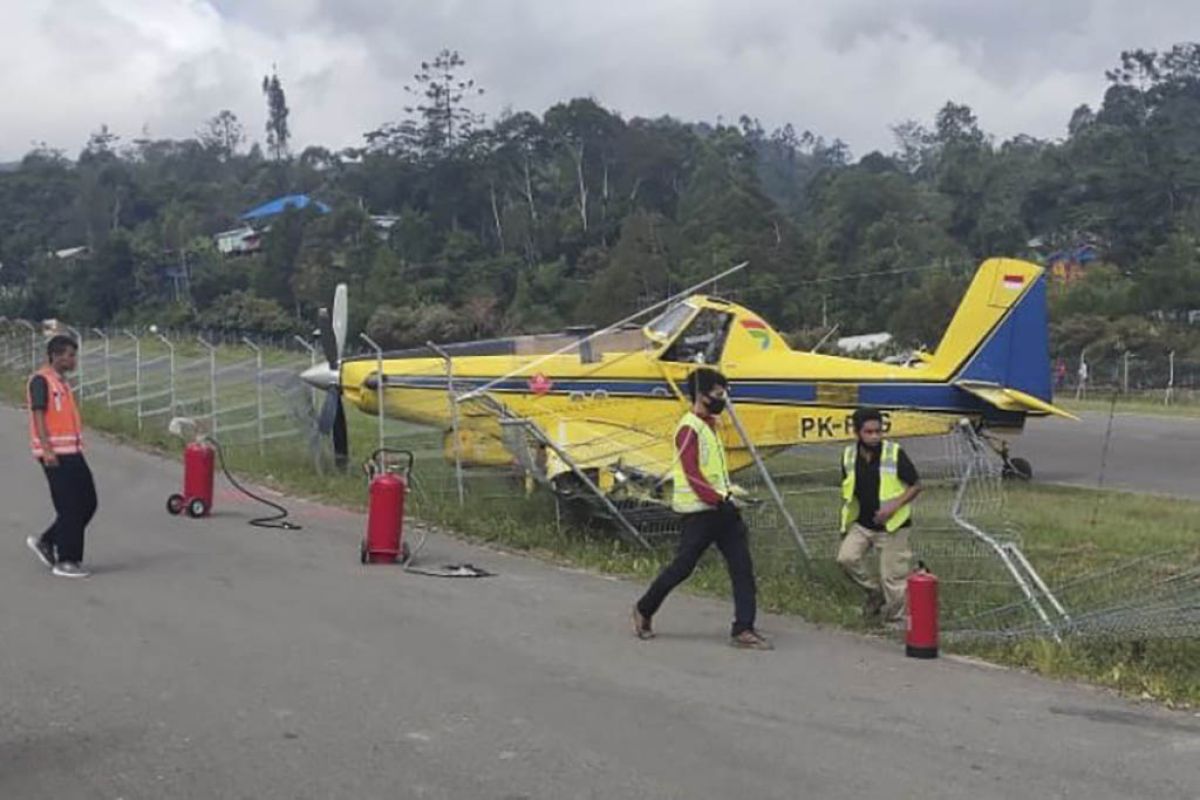 Petugas berada di dekat pesawat dengan nomor penerbangan PK-PAG yang tergelincir di Bandara Karubaga Kabupaten Tolikara, Papua, Selasa (9/6/2020). Pesawat terbang pengangkut BBM bersubsidi yang dioperasikan oleh Pelita Air tersebut tergelincir dan menabrak pagar pembatas landasan pacu saat mendarat, tidak ada korban dalam kecelakaan tersebut. ANTARA FOTO/HO/Humas Polda Papua/nym.