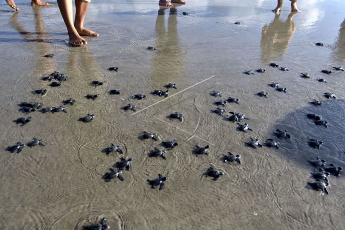Sejumlah Tukik Penyu Lekang (Lepidochelys olivacea) berjalan menuju perairan usai dilepas di Pantai Kuta, Badung, Bali, Selasa (23/6/2020). Pelepasan ratusan tukik yang biasanya diikuti oleh wisatawan untuk edukasi dan atraksi wisata tersebut saat ini hanya dilakukan oleh petugas Bali Sea Turtle Society karena Pantai Kuta masih ditutup dari kunjungan wisatawan untuk mencegah penyebaran pandemi COVID-19. ANTARA FOTO/Fikri Yusuf/nym.
