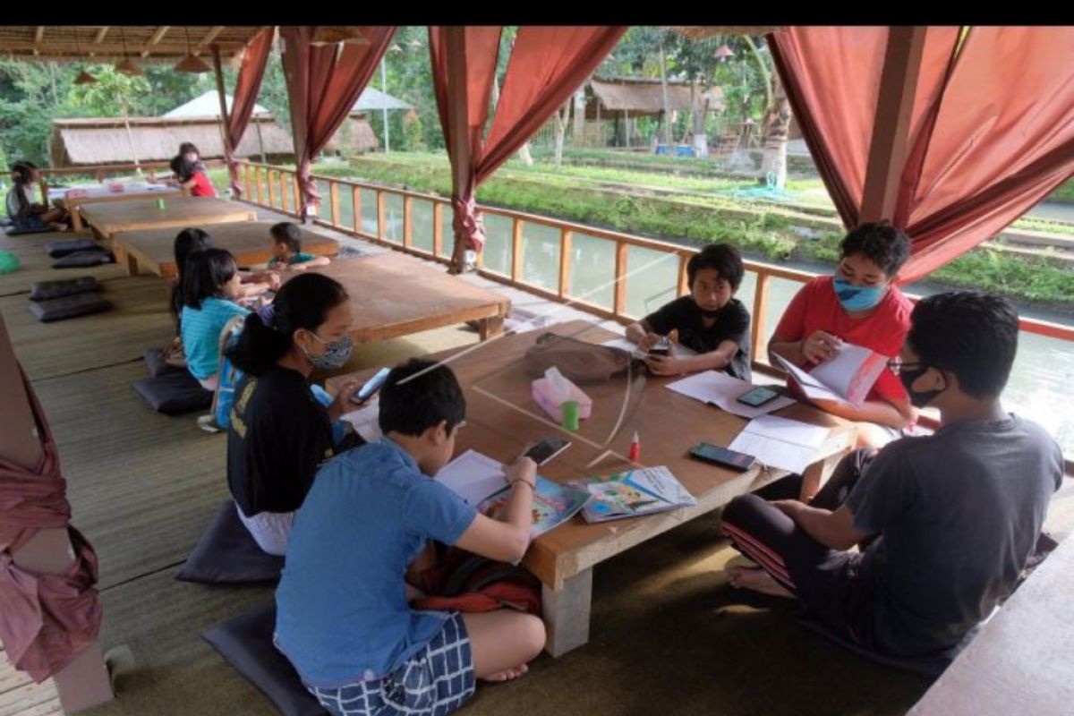 Sejumlah siswa SD belajar secara "online" atau daring di Waroeng D'Abing, Desa Bitera, Gianyar, Bali, Kamis (6/8/2020). Para pelajar SD, SMP dan SMA di kawasan tersebut memanfatkan internet gratis yang disediakan rumah makan tersebut untuk menekan pembiayaan belajar yang tinggi akibat pandemi COVID-19. ANTARA FOTO/Nyoman Hendra Wibowo/nym.