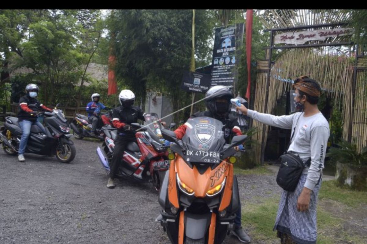 Petugas memeriksa suhu tubuh peserta 'touring' sepeda motor bertajuk "Melali untuk Bali Bangkit" di kawasan wisata Air Terjun Kanto Lampo, Gianyar, Bali, Minggu (4/10/2020). Kegiatan 'touring' yang dilakukan dengan mengunjungi berbagai daya tarik wisata di Pulau Dewata secara bergiliran oleh sejumlah instansi, BUMN, komunitas otomotif serta pelaku usaha tersebut dirancang Pemerintah Provinsi Bali sebagai upaya pemulihan sektor perekonomian dan pariwisata yang terdampak pandemi COVID-19. ANTARA FOTO/Fikri Yusuf/nym.