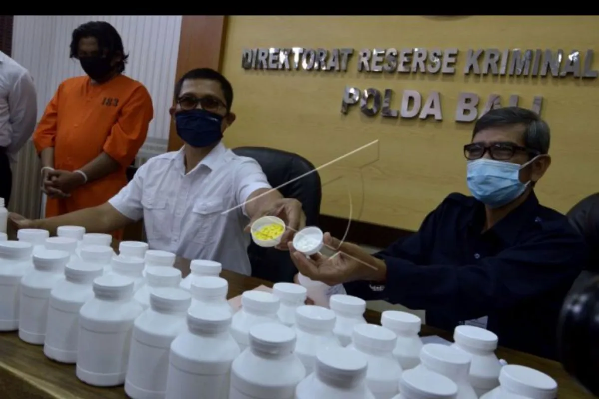 Petugas menunjukkan tersangka berinisial AMF (kiri) dan barang bukti produk obat ilegal saat rilis di Polda Bali, Denpasar, Bali, Senin (26/10/2020). Petugas Balai Besar Pengawas Obat dan Makanan (BBPOM) Denpasar bersama Ditreskrimsus Polda Bali berhasil mengamankan barang bukti sediaan farmasi yang tidak memenuhi syarat dan tanpa izin edar berupa 31.179 tablet obat yang mengandung Tiheksifenidil dan 5.172 tablet obat dengan kandungan Dextromethorpan yang akan diedarkan tersangka AMF. ANTARA FOTO/Fikri Yusuf/nym.