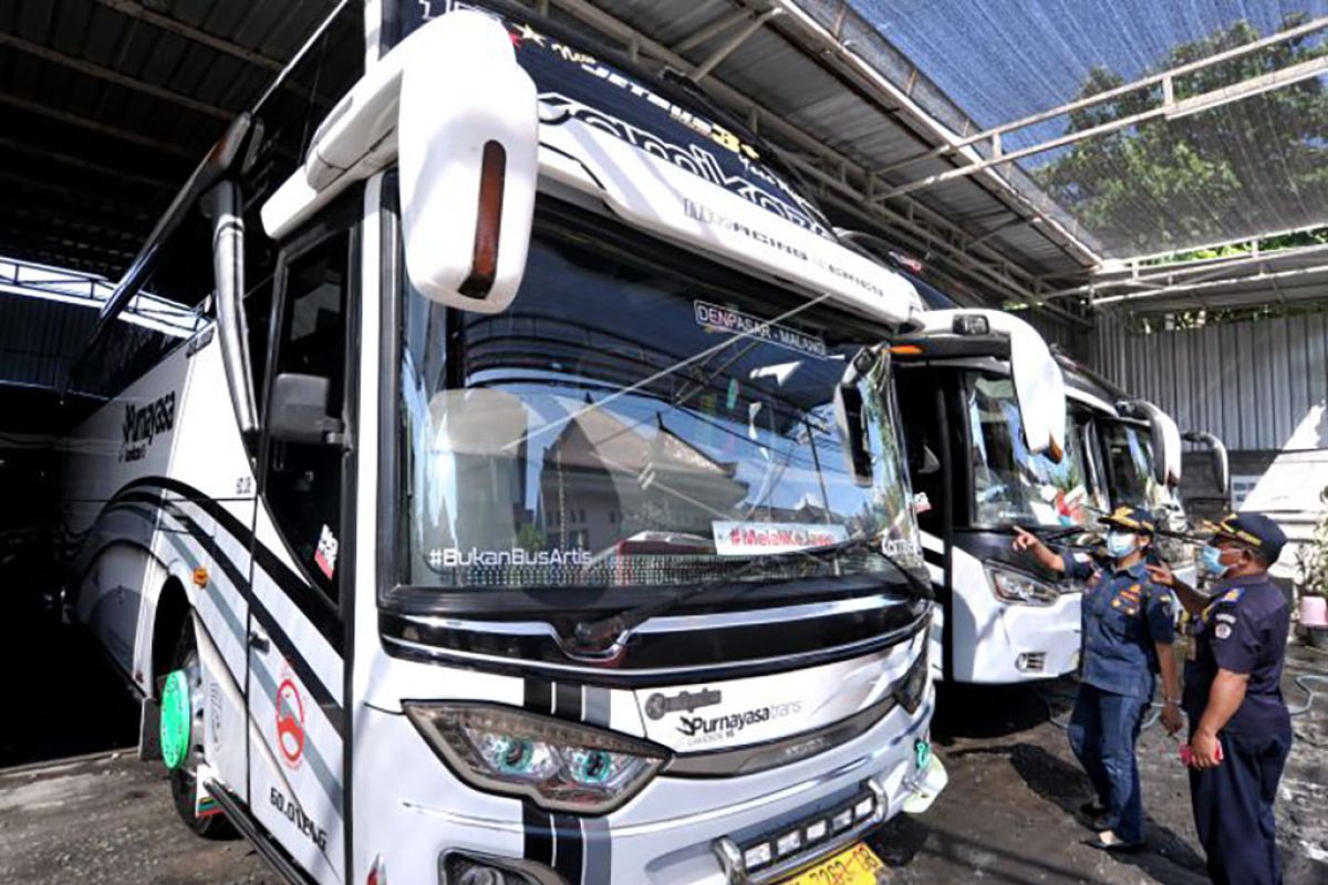 Petugas memeriksa kondisi bus saat melakukan sidak dan pengawasan penyedia jasa transportasi di Denpasar, Bali, Selasa (4/5/2021). Kegiatan itu dilakukan untuk mensosialisasikan larangan mudik Hari Raya Idul Fitri 1442 Hijriah pada 6-17 Mei 2021 dan memastikan agen penyedia jasa transportasi tidak menjual tiket pada periode tersebut sekaligus untuk memeriksa kondisi kelayakan moda transportasi. ANTARA FOTO/Fikri Yusuf/nym.