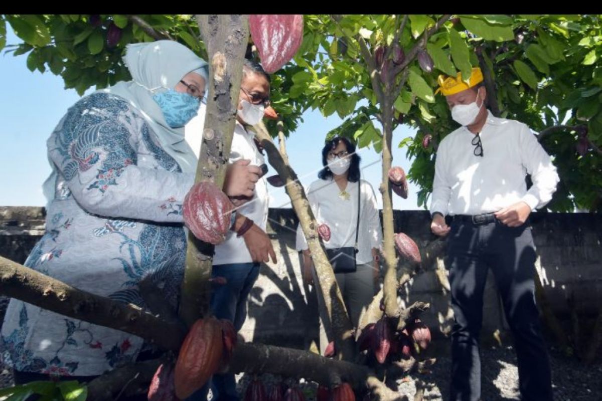 Menteri Perindustrian Agus Gumiwang Kartasasmita (kanan) bersama Wakil Ketua Komisi VI DPR RI Gde Sumarjaya Linggih (kedua kiri) dan Direktur Jenderal Industri Kecil Menengah dan Aneka Kementerian Perindustrian Gati Wibawaningsih (kedua kanan) mengamati buah kakao saat meninjau proses produksi pembuatan cokelat di Delicacao Bali, Tabanan, Bali, Senin (31/5/2021). Kunjungan Menteri Perindustrian di pabrik pembuatan cokelat tersebut untuk mendukung para pelaku industri kecil dan menengah (IKM) sebagai upaya pemulihan ekonomi nasional pada masa pandemi COVID-19. ANTARA FOTO/Nyoman Hendra Wibowo/nym.