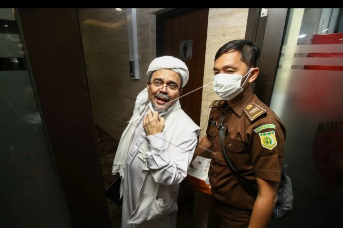 Terdakwa Rizieq Shihab (kiri) memasuki gedung Bareskrim Polri usai menjalani sidang tuntutan di Jakarta, Kamis (3/6/2021). Pada sidang tersebut JPU menuntut Rizieq Shihab pidana penjara selama enam tahun untuk kasus tes usap RS UMMI, Bogor. ANTARA FOTO/Rivan Awal Lingga/nym.