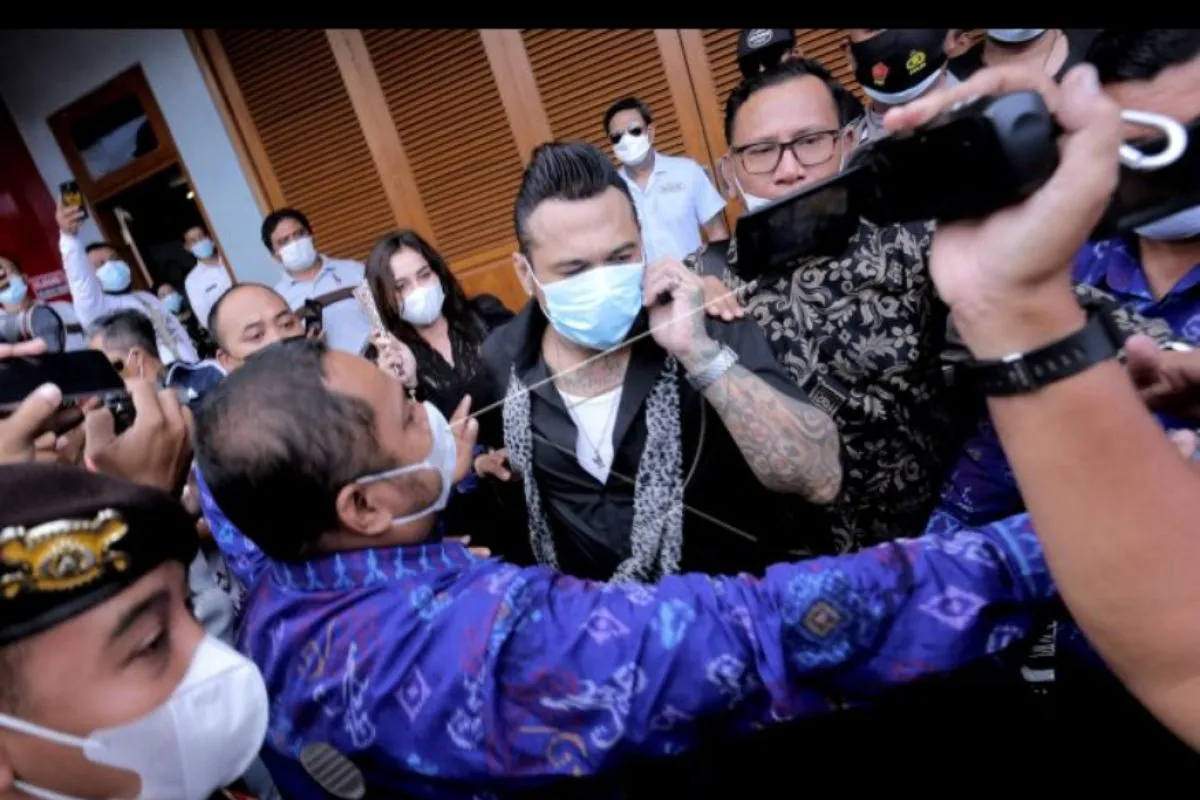 Penabuh drum Superman is Dead I Gede Ari Astina alias Jerinx (tengah) berjalan meninggalkan Lapas Kerobokan, Bali, Selasa (8/6/2021). Jerinx bebas murni dari Lapas Kerobokan setelah menjalani hukuman pidana penjara karena kasus ujaran kebencian dan pencemaran nama baik yang dilaporkan Ikatan Dokter Indonesia (IDI) Bali. ANTARA FOTO/Rani Rachmania/nym.