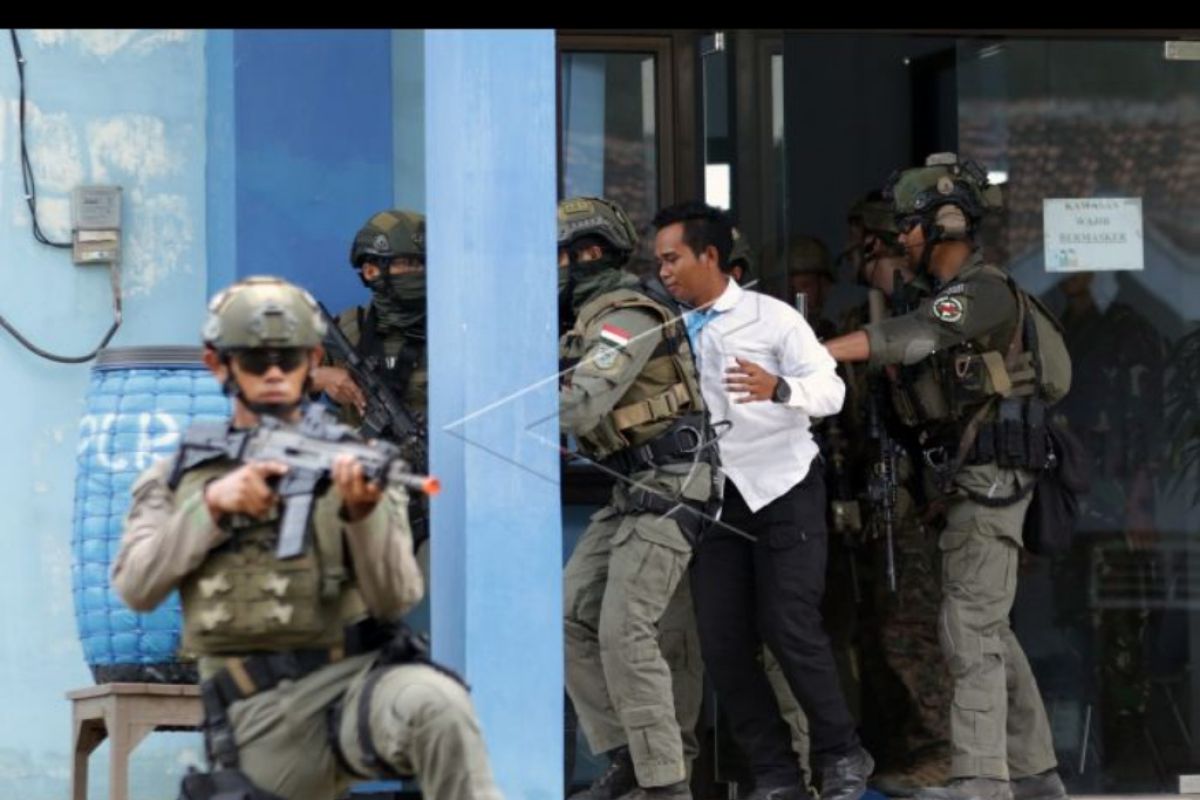 Prajurit Batalyon Intai Amfibi (Yontaifib) Korps Marinir TNI AL melakukan latihan pembebasan sandera bersama United States Marines Corps Reconnaissance Unit bersandi Reconex 21-II di Pancer, Pesanggaran, Banyuwangi, Jawa Timur, Senin (15/6/2021). Aksi pembebasan sandera itu merupakan pengaplikasian skenario latihan pasukan elit kedua negara di Pusat Latihan Pertempuran Marinir (Puslatpurmar) 5 Baluran dan Puslatpurmar 7 Lampon selama dua pekan. ANTARA FOTO/Budi Candra Setya/nym.