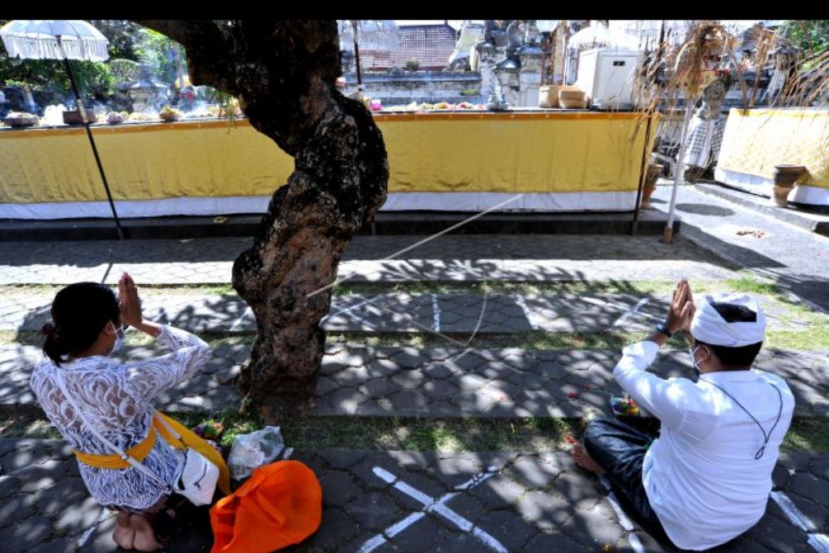 Umat Hindu bersembahyang saat Hari Pagerwesi di Pura Jagatnatha, Denpasar, Bali, Rabu (1/9/2021). Persembahyangan Hari Pagerwesi yang merupakan rangkaian Hari Saraswati atau hari turunnya ilmu pengetahuan oleh umat Hindu di Bali untuk memohon keteguhan iman dalam menerapkan ilmu pengetahuan tersebut dilakukan dengan menerapkan protokol kesehatan pencegahan pandemi COVID-19 dan membatasi jumlah umat di Pura selama kegiatan persembahyangan. ANTARA FOTO/Fikri Yusuf/nym.