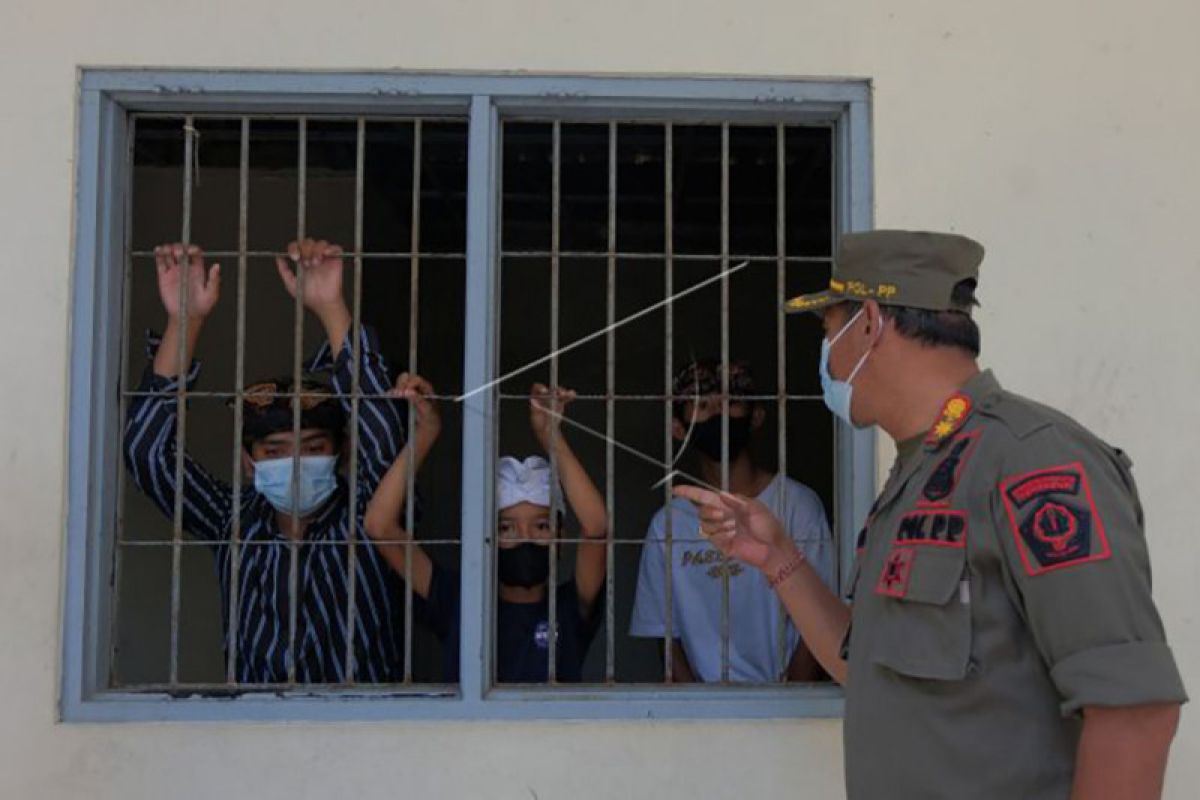 Kepala Satpol PP Kota Denpasar I Dewa Gede Anom Sayoga memberikan pembinaan terhadap sejumlah remaja berusia belasan tahun yang sehari-hari mengamen dengan mengenakan busana adat Bali saat terjaring razia penertiban gelandangan dan pengemis (gepeng) di Denpasar, Bali, Selasa (28/9/2021). Hasil penanganan sosial Satpol PP Kota Denpasar dari bulan Januari hingga September 2021 tersebut mendata sebanyak 273 orang terlantar, gepeng, pengasong dan pengamen yang terjaring razia penertiban pada masa pandemi COVID-19 itu sebagian besar merupakan anak-anak di bawah umur. ANTARA FOTO/Nyoman Hendra Wibowo/nym.
