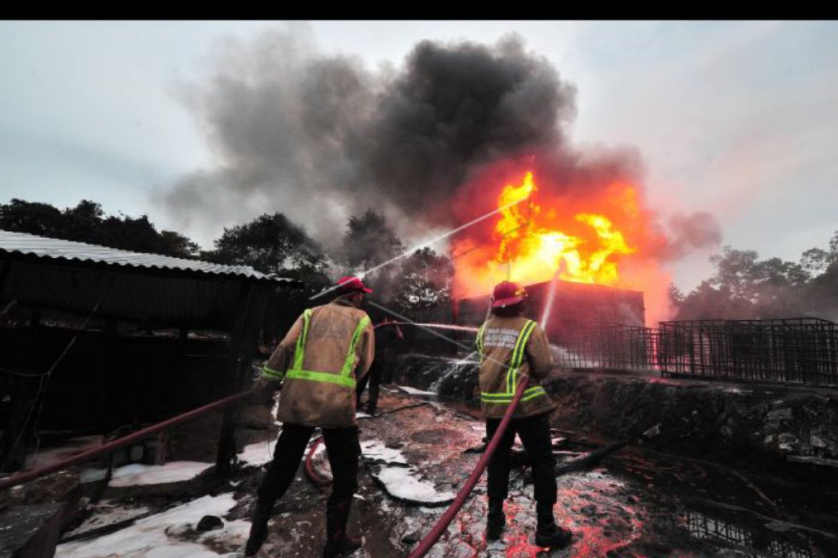 Petugas memadamkan api yang membakar tempat penyulingan minyak mentah ilegal di Jambi Luar Kota, Muarojambi, Jambi, Senin (18/10/2021). Aparat Kepolisian Sektor Jambi Luar Kota yang turut dalam upaya pemadaman bersama petugas Satpol PP dan Pemadam Kebakaran Kabupaten Muarojambi masih menyelidiki penyebab kebakaran. ANTARA FOTO/Wahdi Septiawan/nym.