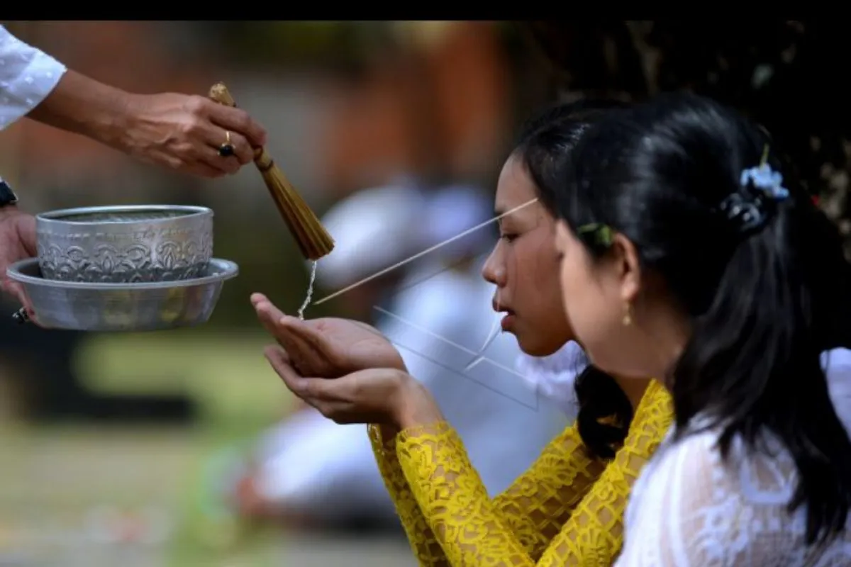 Pemuka agama Hindu memercikkan air suci saat persembahyangan Hari Pagerwesi di Pura Jagatnatha, Denpasar, Bali, Rabu (30/3/2022). Hari Pagerwesi merupakan rangkaian Hari Saraswati atau hari turunnya ilmu pengetahuan yang diperingati oleh umat Hindu di Bali dengan melakukan persembahyangan untuk memohon keteguhan iman dalam menerapkan ilmu pengetahuan. ANTARA FOTO/Fikri Yusuf/nym.