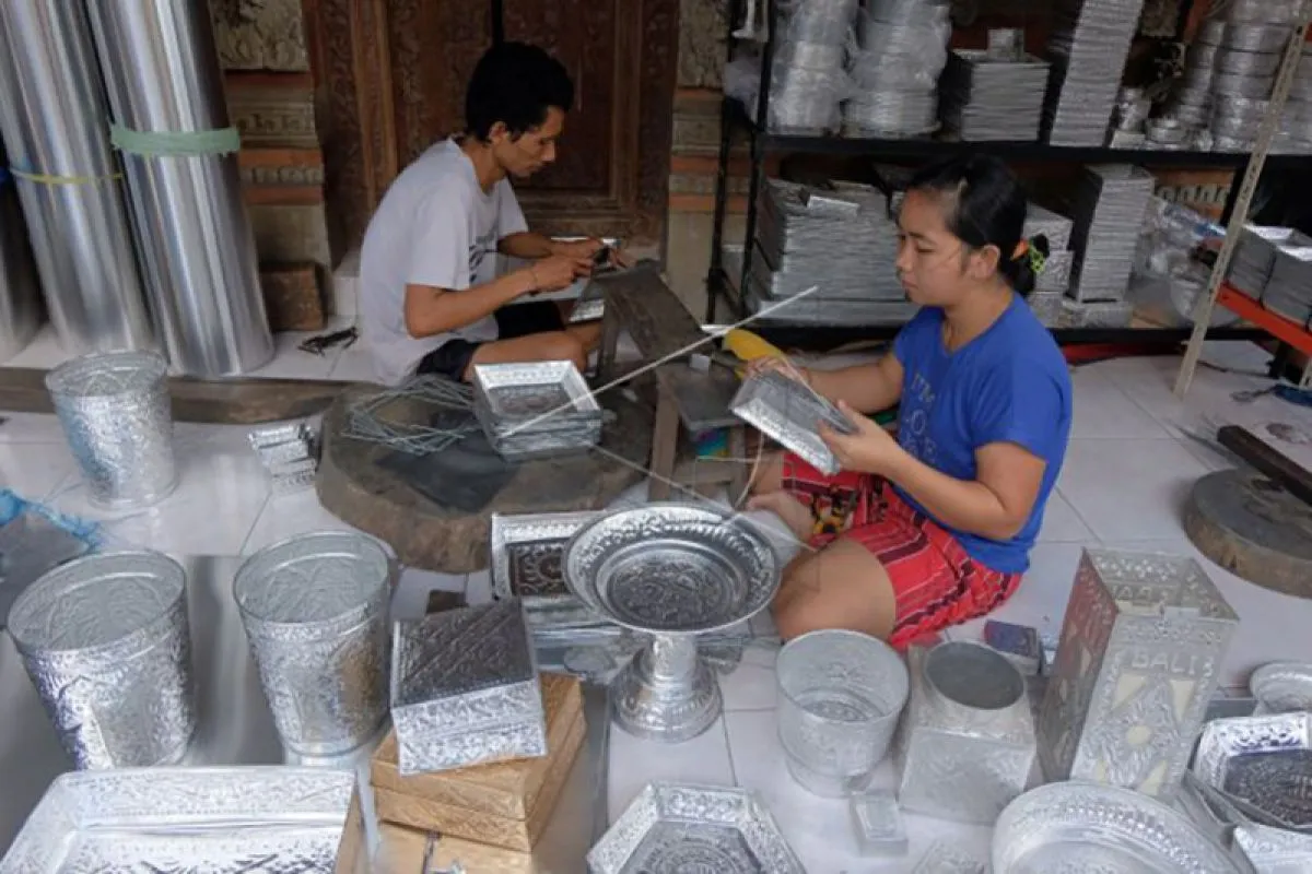 Perajin menyelesaikan pembuatan kerajinan berbahan aluminium dengan cara manual di Bali Anugrah, Denpasar, Bali, Kamis (2/6/2022). Mulai tahun 2022, perajin mampu mengekspor sebanyak 720 produk kerajinan berbahan aluminium ke Filipina, Inggris dan Spanyol dengan harga Rp2.500 - Rp700.000 per buah sesuai ukuran dan kualitas. ANTARA FOTO/Nyoman Hendra Wibowo/nym.