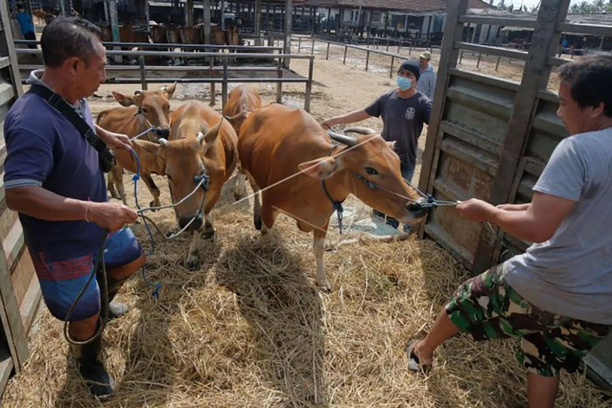 Pekerja menggiring sapi Bali ke atas truk untuk dikirim ke Rumah Potong Hewan (RPH) Kota Denpasar di Pasar Hewan Beringkit, Badung, Bali, Minggu (3/7/2022). Dinas Pertanian dan Ketahanan Pangan Provinsi Bali menghentikan sementara pengiriman sapi Bali ke luar pulau sejak Sabtu (2/7) menyusul adanya 63 kasus sapi terjangkit penyakit mulut dan kuku (PMK) di tiga kabupaten di Bali sehingga 55 ekor sapi terjangkit telah dimusnahkan. ANTARA FOTO/Nyoman Hendra Wibowo/nym.