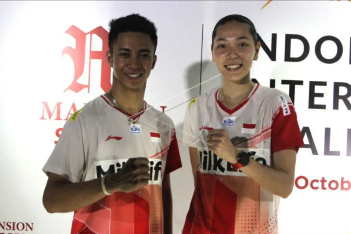 Pasangan ganda campuran Indonesia, Dejan Ferdinansyah (kiri) dan Gloria Emanuelle Widjaja (kanan) berselebrasi usai mengalahkan lawannya sesama pebulutangkis asal Indonesia Ghana Muhammad Al Ilham/Indah Cahya Sari Jamil dalam semi final Indonesia International Challenge 2022 di Platinum Arena, Malang, Jawa Timur, Sabtu (15/10/2022). Dejan/Gloria berhak melaju ke final setelah menang dengan skor 2-0 (21-14, 21-14). ANTARA FOTO/Ari Bowo Sucipto/nym.