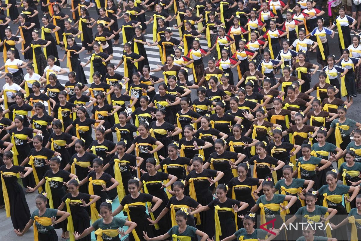Ribuan pelajar menampilkan Tari Sekar Jempiring saat memperingati Hari Tari Sedunia dalam acara Naluriku Menari (NAME) di Denpasar, Bali, Sabtu (29/4/2023). Kegiatan yang digelar oleh Pemerintah Kota Denpasar bersama Komunitas Seni Naluri Manca tersebut diikuti sebanyak 2.145 seniman dan kawula muda dengan mengusung tema "Menari Mengalir Seperti Air, Cipta Akan Peradaban" untuk berkreativitas secara berkesinambungan serta pelestarian budaya. ANTARA FOTO/Nyoman Hendra Wibowo/wsj.