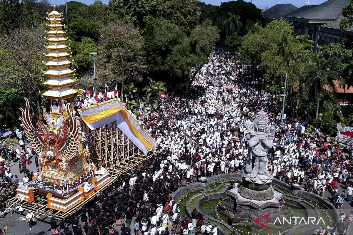 Foto udara umat Hindu yang melakukan rangkaian ritual di dekat bade atau menara usungan jenazah Raja Denpasar IX Ida Tjokorda Ngurah Jambe Pemecutan saat upacara Pelebon di Denpasar, Bali, Rabu (21/6/2023). Puncak upacara Pelebon Raja Denpasar IX yang meninggal pada 18 Februari 2023 itu disaksikan oleh ribuan warga dan wisatawan. ANTARA FOTO/Fikri Yusuf/wsj.