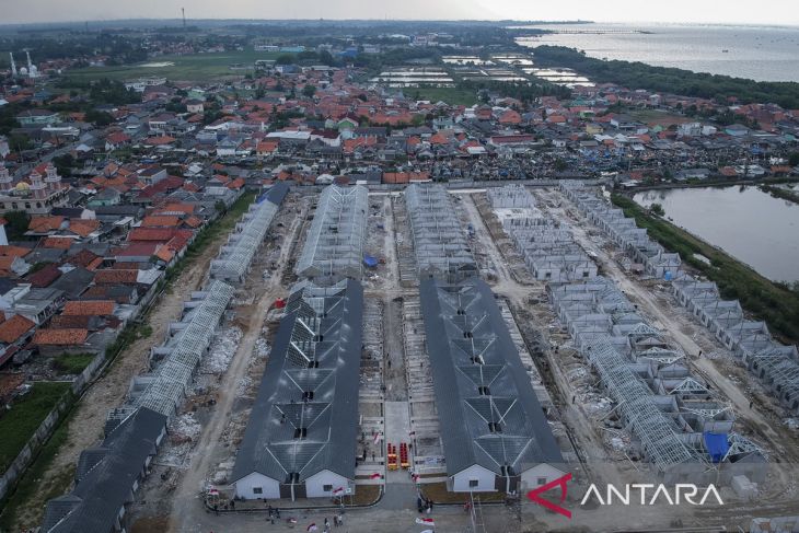 Foto udara proyek pembangunan rumah untuk masyarakat berpenghasilan rendah (MBR) di Desa Sukawali, Pakuhaji, Kabupaten Tangerang, Banten, Rabu (17/9/2025). Pembangunan sebanyak 250 unit rumah yang termasuk dalam program tiga juta rumah oleh Kementerian Perumahan dan Kawasan Permukiman bersama dengan pihak swasta tersebut progresnya sudah mencapai 42,85 persen dan ditargetkan selesai pada November 2025. ANTARA FOTO/Putra M. Akbar/gp