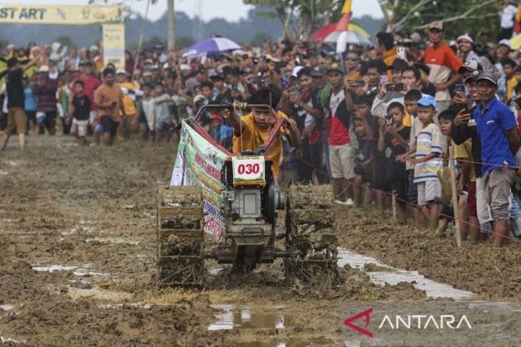 Peserta memacu traktornya pada lomba balap traktor sawah saat berlangsung Sukaresmi AgriFest di Desa Sukaresmi, Kecamatan Sukaresmi, Kabupaten Pandeglang, Banten, Senin (22/9/2025). Festival yang diisi dengan berbagai kegiatan seperti kirab budaya, pameran hasil tani, dan lomba balap traktor sawah tersebut digelar untuk mempromosikan hasil pertanian masyarakat di kecamatan itu sekaligus sebagai ajang silaturahmi antarpetani. ANTARA FOTO/Angga Budhiyanto/gp