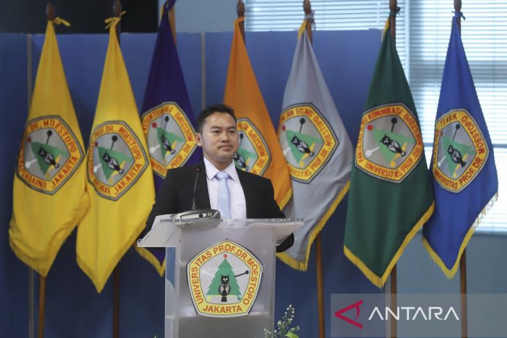 Dewan Pengawas Antara Ariawan memberi sambutan usai sidang promosi gelar doktor pada program Administrasi Publik di Universitas Moestopo di Jakarta, Sabtu (18/10/2025).