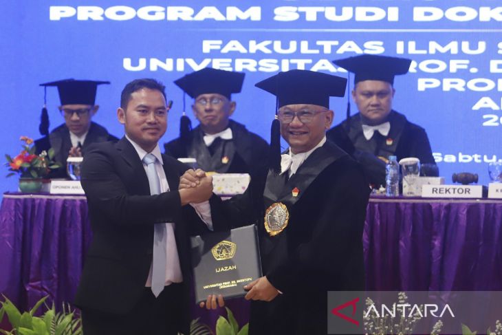 Dewan Pengawas Antara Ariawan (kiri) menerima tanda bukti kelulusan dari Rektor Universitas Prof. Dr. Moestopo (Beragama) Syaifullah serta sejumlah guru besar usai mengikuti sidang promosi gelar doktor pada program Administrasi Publik di Universitas Moestopo di Jakarta, Sabtu (18/10/2025).