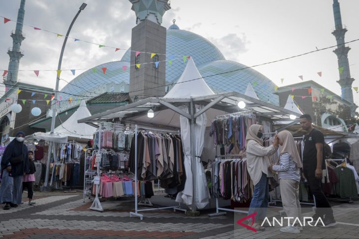 Warga melihat pakaian yang dijual di salah satu stan pada Ramadhan Al-Azhom Festival di Masjid Raya Al-Azhom, Kota Tangerang, Banten, Sabtu (21/2/2026). Festival yang berlangsung hingga 18 Maret 2026 dengan kegiatan pentas seni Islami, aneka perlombaan, bazar UMKM dan kuliner takjil tersebut guna meningkatkan daya tarik wisata religi sekaligus memperkuat perekonomian masyarakat selama bulan Ramadhan. ANTARA FOTO/Putra M. Akbar/gp