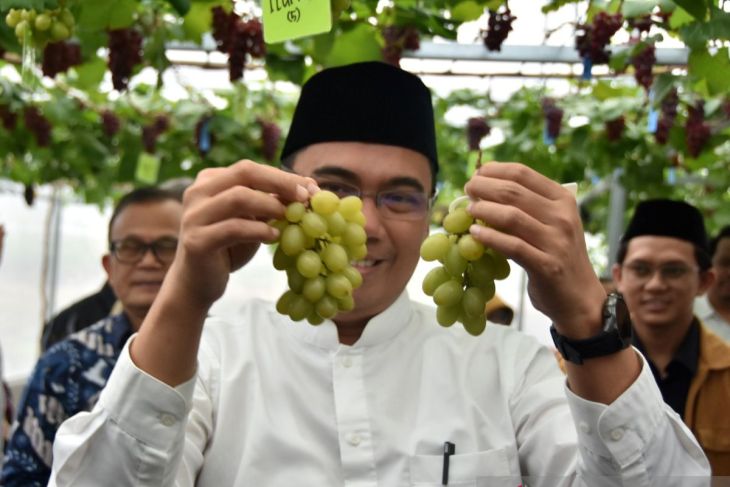 Rektor IPB University Alim Setiawan Slamet menunjukkan anggur jenis Ilaria saat panen anggur perdana di kawasan Agribusiness and Technology Park (ATP) IPB University, Desa Cikarawang, Kabupaten Bogor, Jawa Barat, Jumat (6/3/2026). Panen anggur tropis perdana yang mampu tumbuh dan berproduksi dengan baik di Indonesia tersebut menjadi bagian dari riset pengembangan buah lokal yang dilakukan IPB University untuk mendukung peningkatan produksi hortikultura nasional sekaligus mengurangi ketergantungan Indonesia terhadap impor buah. ANTARA Megapolitan/Arif Firmansyah.