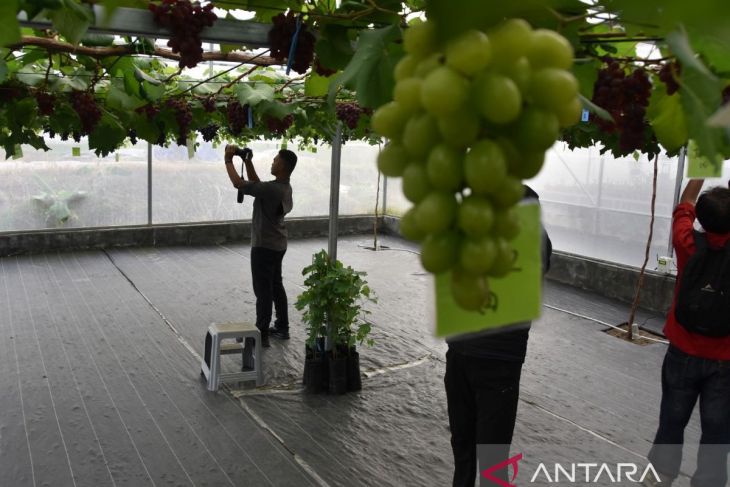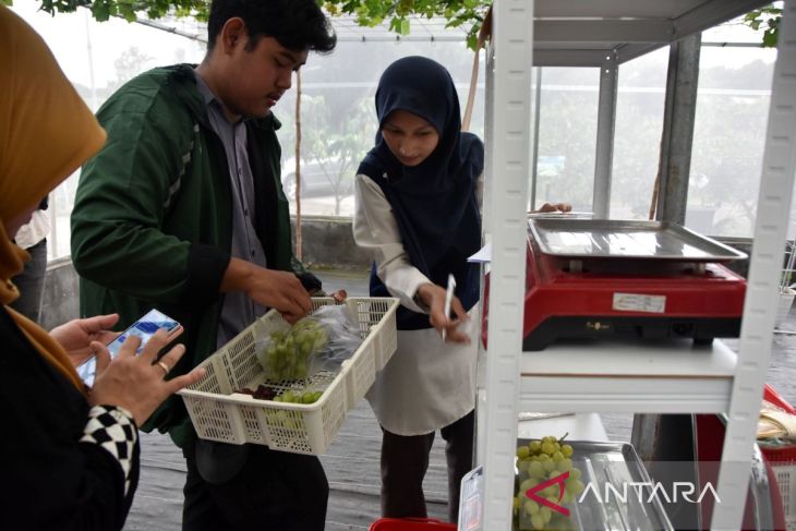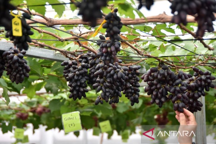 Pengunjung memegang anggur jenis Gosv saat panen anggur perdana di kawasan Agribusiness and Technology Park (ATP) IPB University, Desa Cikarawang, Kabupaten Bogor, Jawa Barat, Jumat (6/3/2026). Panen anggur tropis perdana yang mampu tumbuh dan berproduksi dengan baik di Indonesia tersebut menjadi bagian dari riset pengembangan buah lokal yang dilakukan IPB University untuk mendukung peningkatan produksi hortikultura nasional sekaligus mengurangi ketergantungan Indonesia terhadap impor buah. ANTARA Megapolitan/Arif Firmansyah.